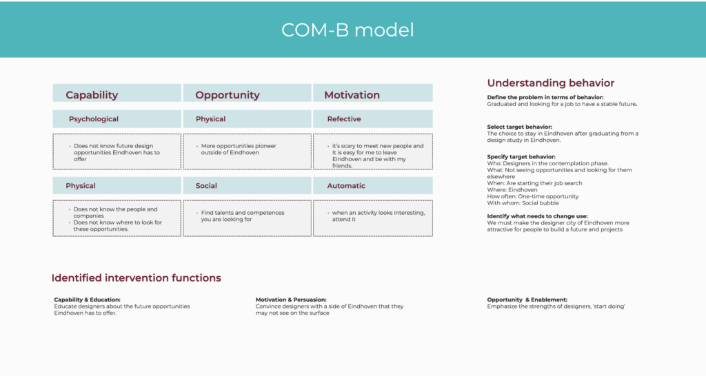 Within this project, we refined the existing business model of Design Mystery Meetup and developed a renewed concept focused on bringing people together through structured encounters that stimulate collaboration and shared projects. Using methods such as PESTEL, stakeholder mapping, user interviews, SWOT, trend analysis, and the COM B model, we analyzed the ecosystem connecting designers, municipalities, educational institutions, and industry. This resulted in a non profit platform concept aimed at designers in the contemplation phase of their careers, exploring how design talent can be better connected to the city.
