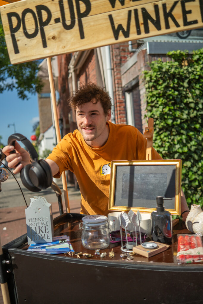 Fragments of the film were placed in photo frames. On the street, people could listen to these stories and become familiar with the concept and the giveaway shop.